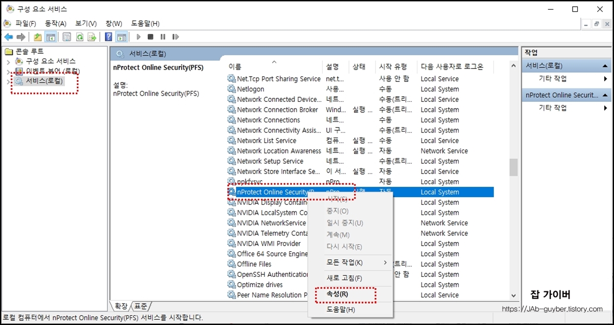 이후 서비스(로컬)에서 nProtect를 찾아 속성으로 들어갑니다.