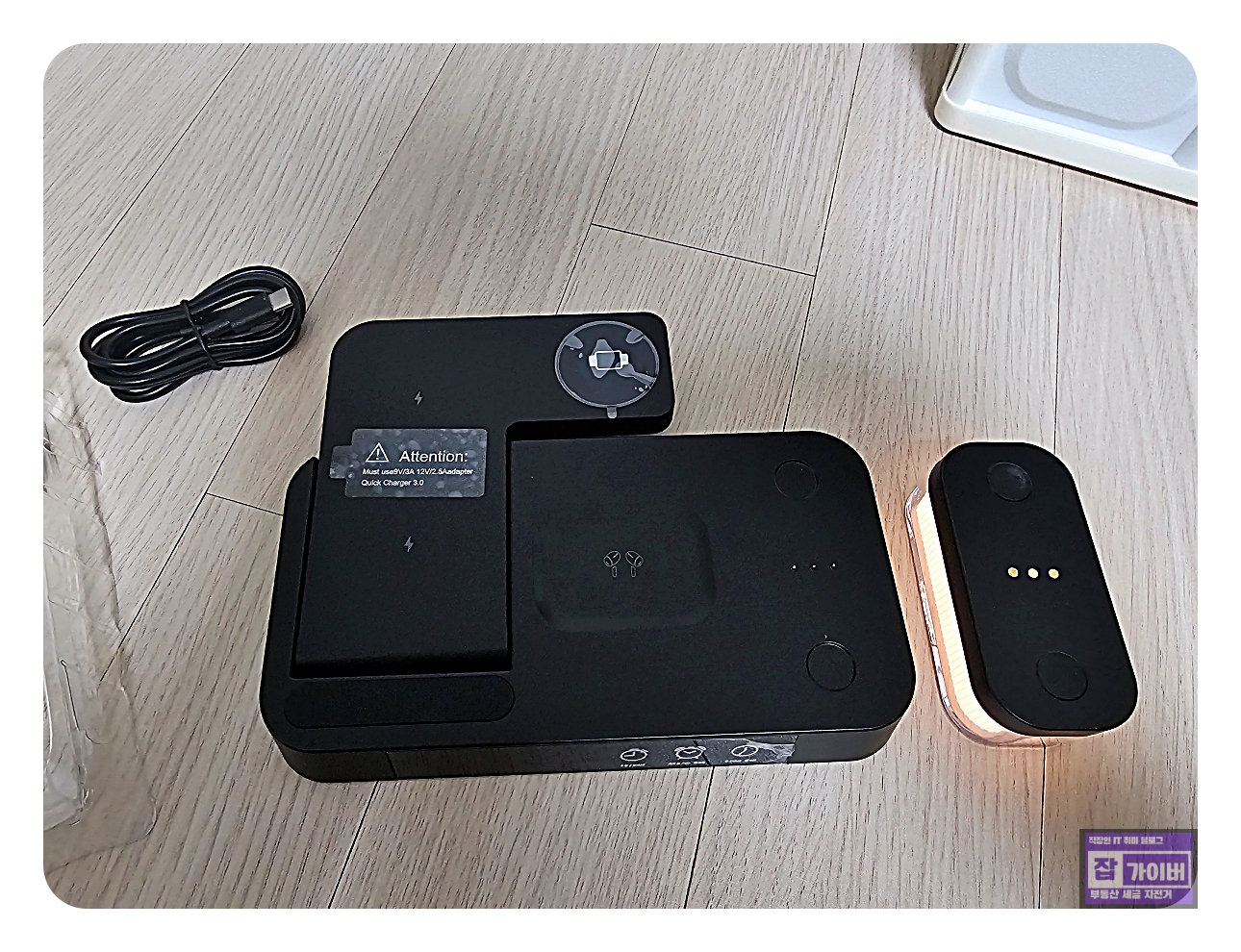 패키지를 열어보니 구성품이 꽤 알찼습니다.우선 핸드폰, 갤럭시워치, 갤럭시버즈를 동시에 충전할 수 있는 3IN1 충전 독에, 심지어 조명과 시계 기능까지 포함되어 있었습니다.
