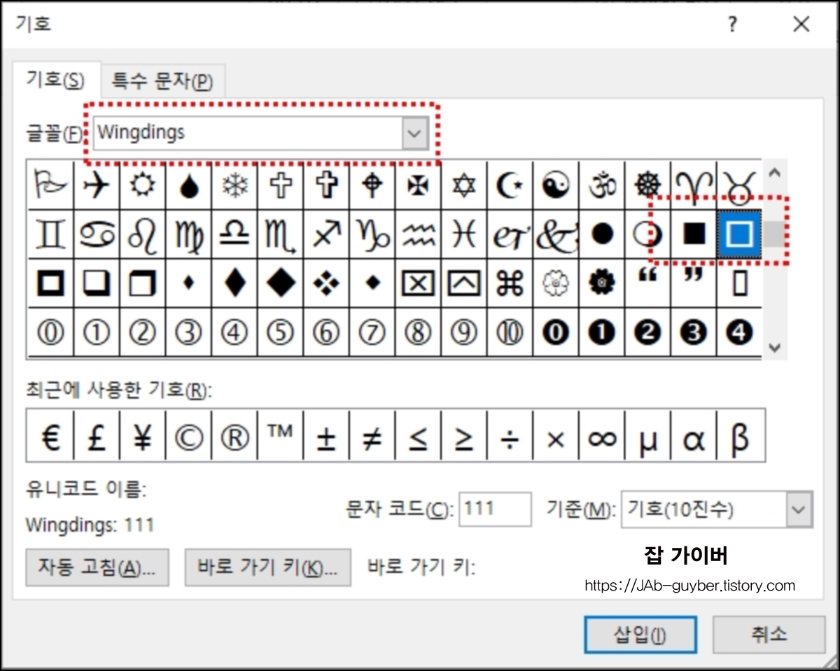 전 방법과 동일하게 Wingdings 글꼴 목록 안에 체크가 없는 특수 기호 박스가 선택하면 됩니다.