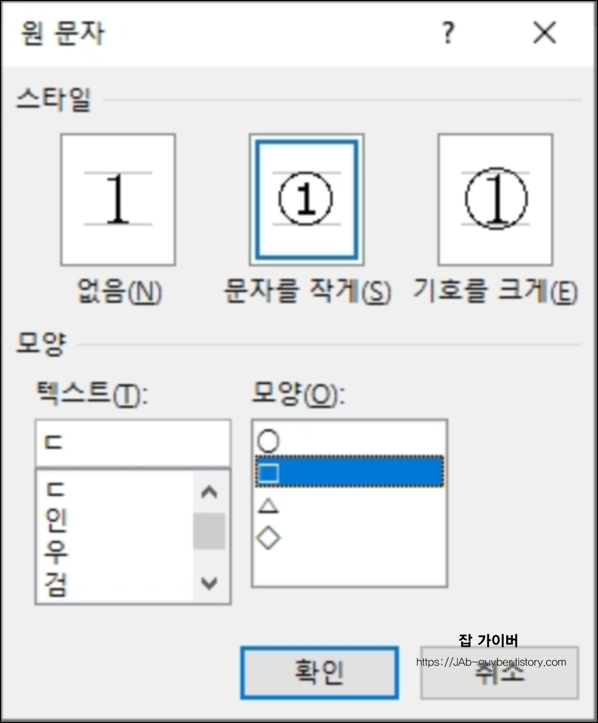바로 옆에 있는 사각형 박스 안에 집어 넣은 다음 텍스트와 모양을 선택하고[확인]버튼을 누르면 체크 표시가 들어간 사각형 박스가 만들어 집니다.