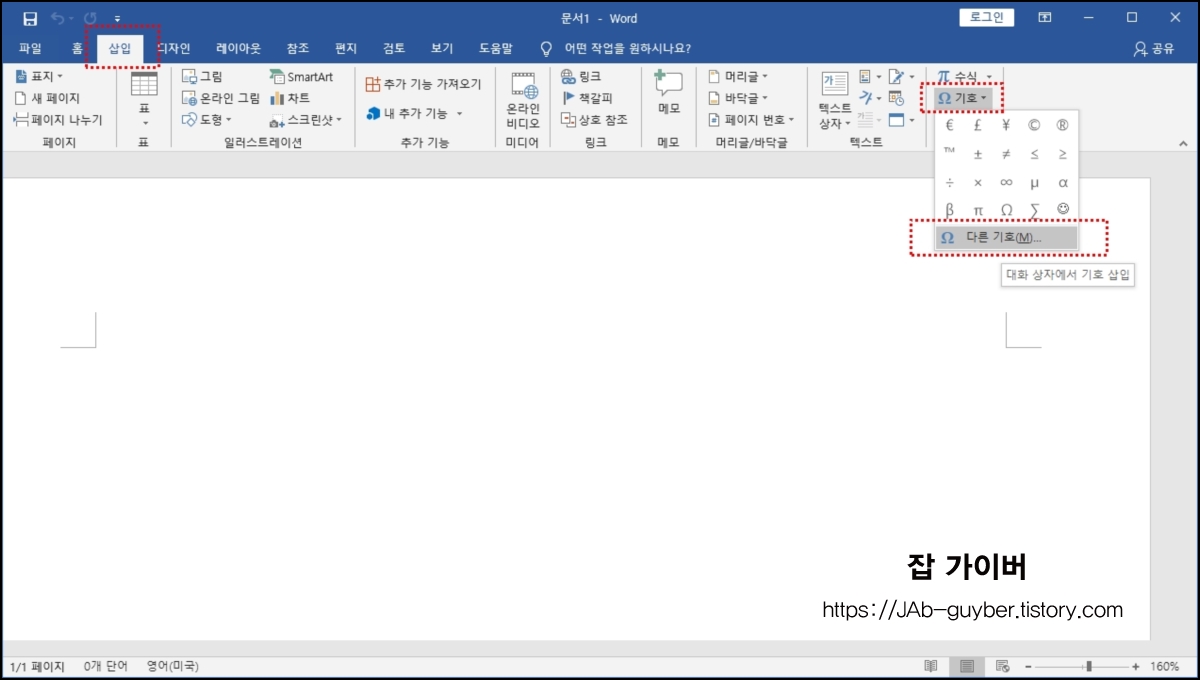 워드 프로그램을 실행 후 상단메뉴에서 [삽입] 탭으로 가서 [기호] > [다른 기호] 리본 메뉴를 클릭합니다.