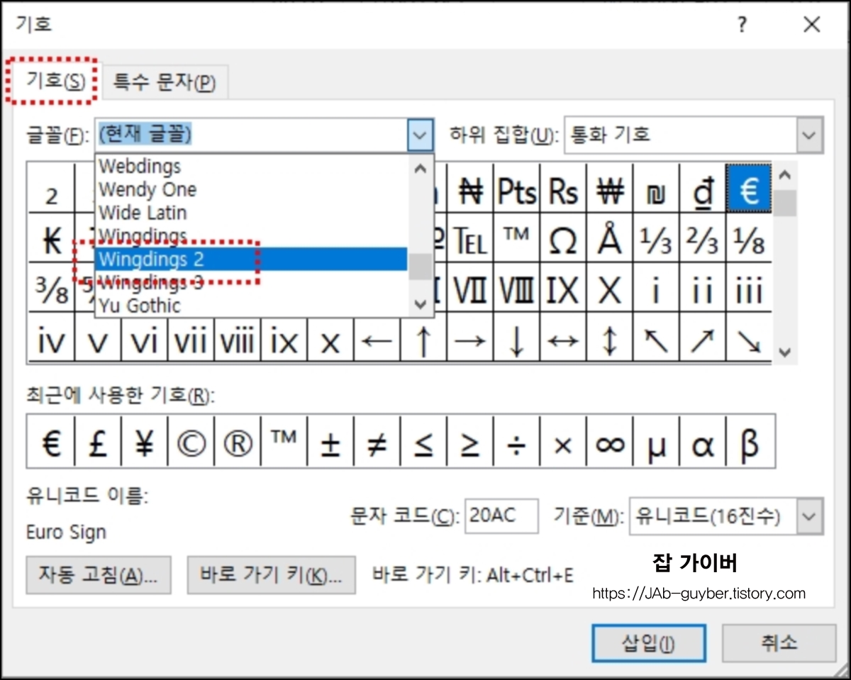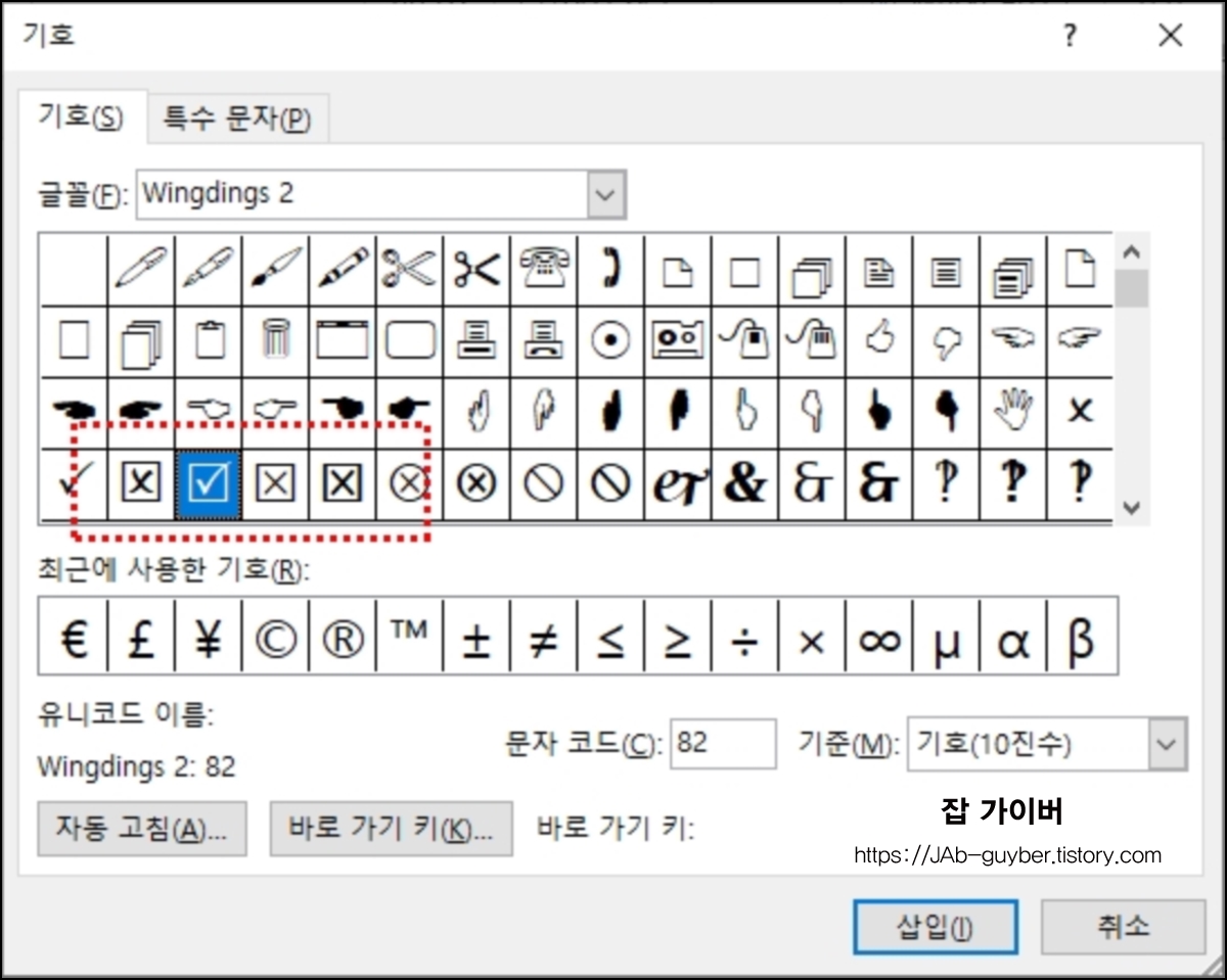 전 방법과 동일하게 Wingdings 글꼴 목록 안에 체크가 없는 특수 기호 박스가 선택하면 됩니다.
