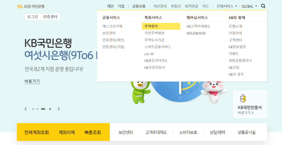 상단 메뉴에서 전체 서비스 또는 개인 > 금융편의 메뉴를 열어보면, 특화서비스 > 주택청약 항목이 따로 구성되어 있습니다.