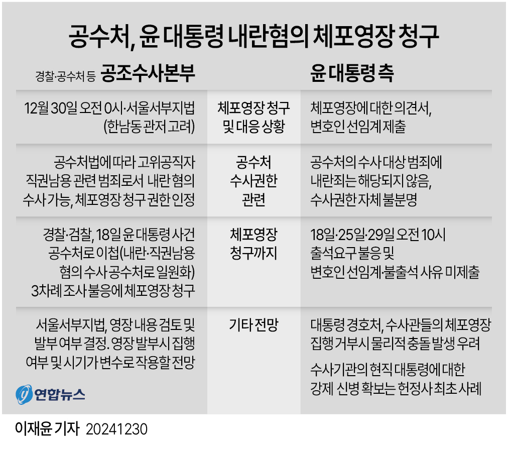 윤 대통령 측은 체포영장을 "불법적이고 위헌적인 수사행위"라고 주장하며, 강한 반발 의사를 표명했습니다. 하지만 공수처는 "법원에서 발부한 체포영장이므로 적법하다"는 입장을 고수했습니다.