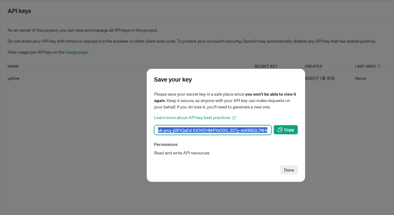 3. 보안 유지: 키를 분실하거나 노출되었다면 즉시 OpenAI의 API 키 관리 페이지에서 해당 키를 삭제하고 새 키를 발급받으세요.