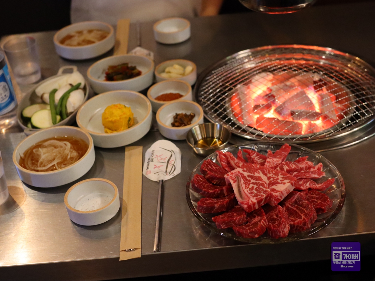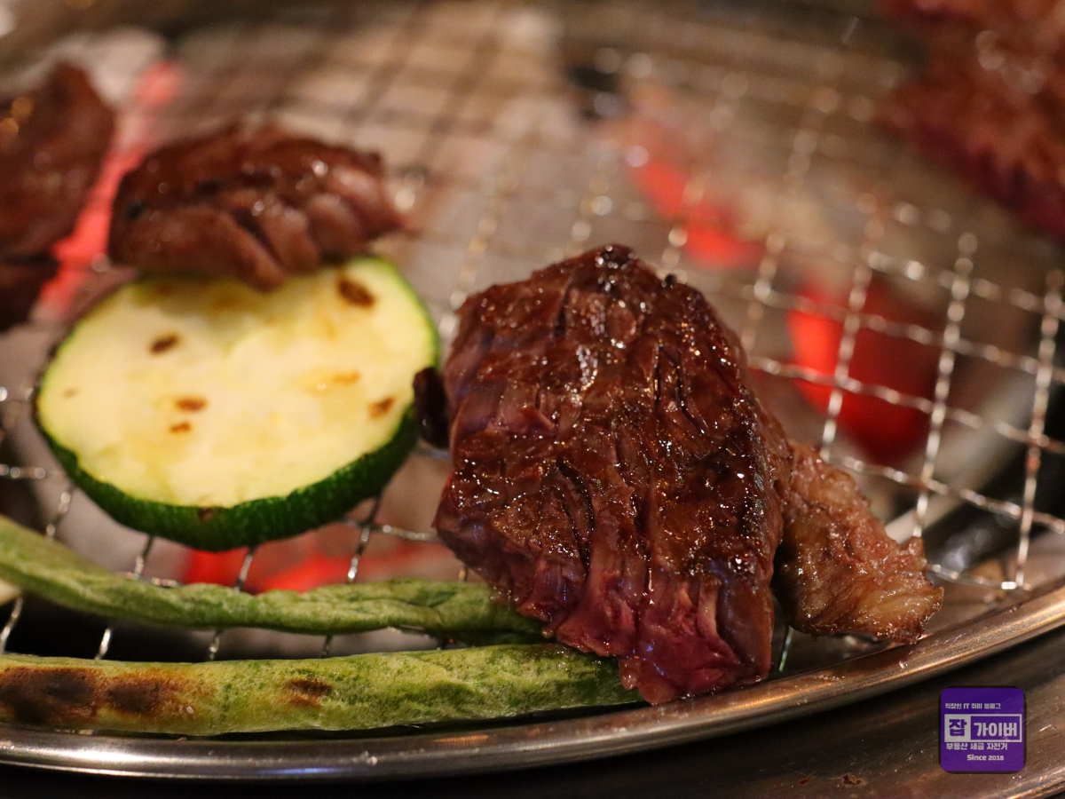 특히 명이나물 장아찌와 고기를 함께 먹었을 때, 그 감칠맛이 고기 본연의 맛을 한층 더 끌어올려주었습니다. 고추채 장아찌와 표고버섯 와사비도 독특한 조합으로, 고기의 맛을 색다르게 즐길 수 있었습니다. 숯불의 화력도 아주 훌륭해서 고기를 천천히, 골고루 익히기에 딱 좋았습니다.