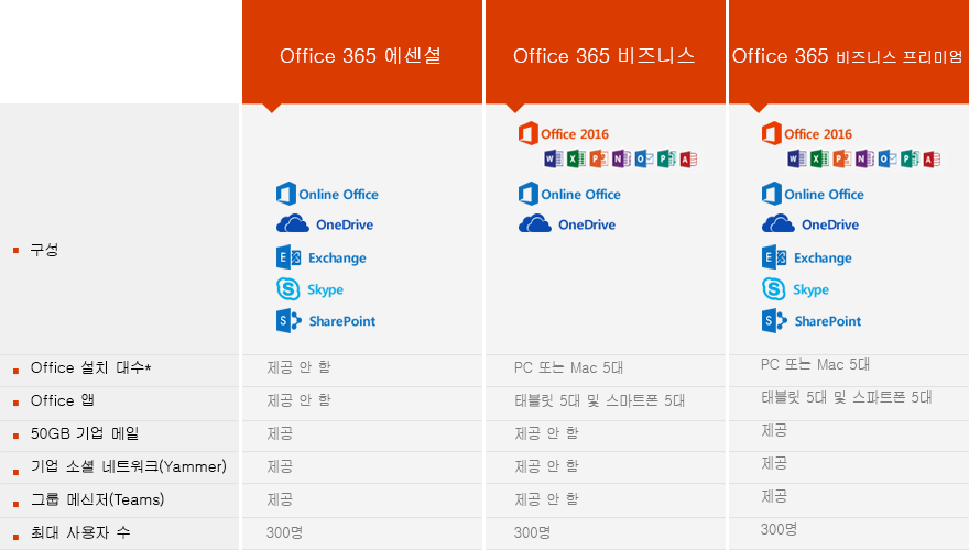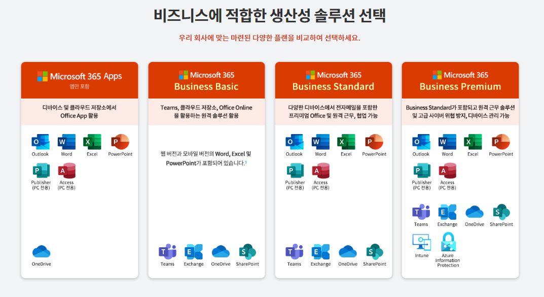 | 이메일/일정 | Outlook | 이메일 송수신, 일정관리, 연락처, 할일 목록 통합 관리 가능 |