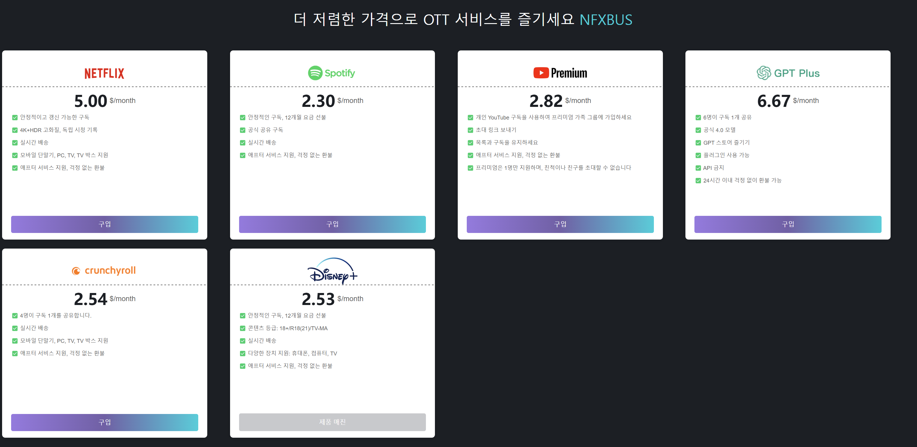 국제 결제 플랫폼(PayPal 등)을 지원하고 있으며, 자체 환불 정책도 운영 중입니다. 다만, 특성상 공유 계정 형태이기 때문에 이용 전 이용 약관과 환불 규정을 충분히 숙지하는 것이 좋습니다.