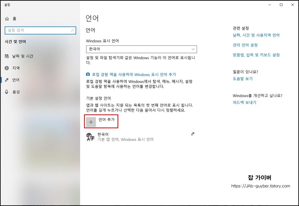 그럼 현재 재 PC에는 한국어만 설치가 되어 있으며 언어 추가 버튼을 클릭합니다.