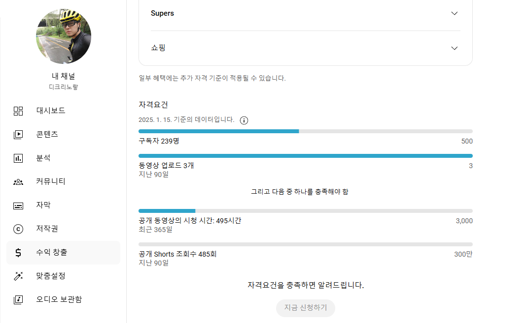 - 애드센스와 연결하려는 유튜브 채널이 수익 창출 조건을 충족했는지 확인.