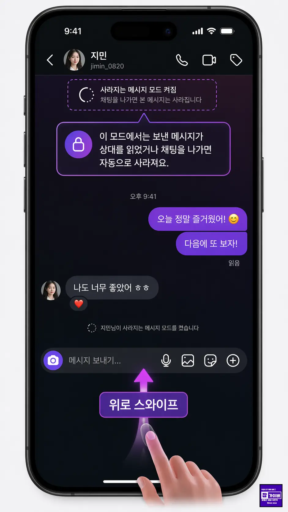 | 사라지는 메시지 모드 | 대화창에서 위로 스와이프 | 대화창에서 위로 스와이프 또는 상단 안내 확인 |