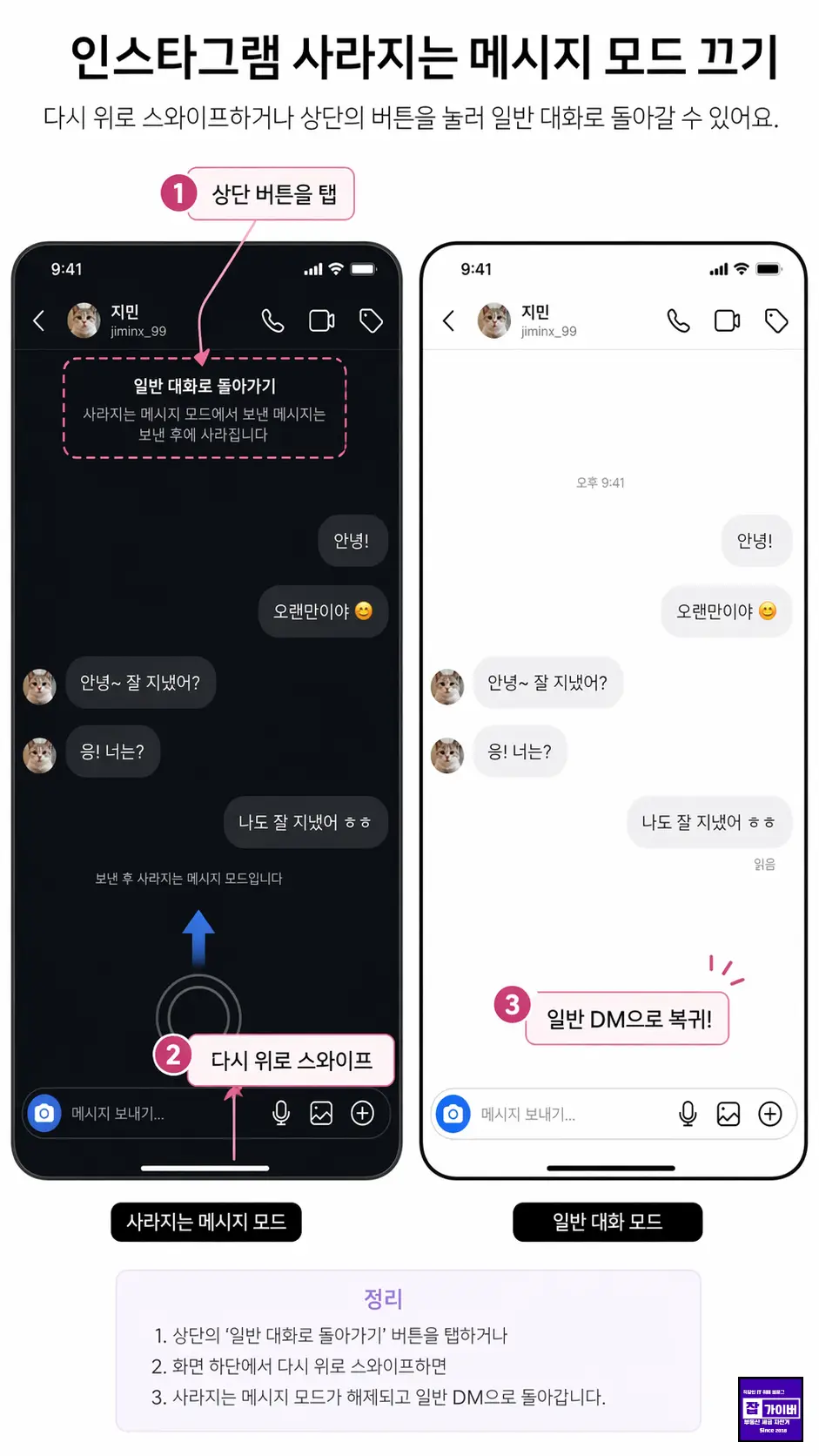 앱 버전이나 계정 상태에 따라 메뉴명과 표시 방식은 조금씩 달라질 수 있습니다. 같은 인스타그램이라도 iPhone과 Android에서 화면 구성이나 버튼 위치가 다르게 보일 수 있으니, 핵심은 DM 대화방 안에서 위로 스와이프해 모드를 켜고 끄는 구조라고 보면 됩니다.