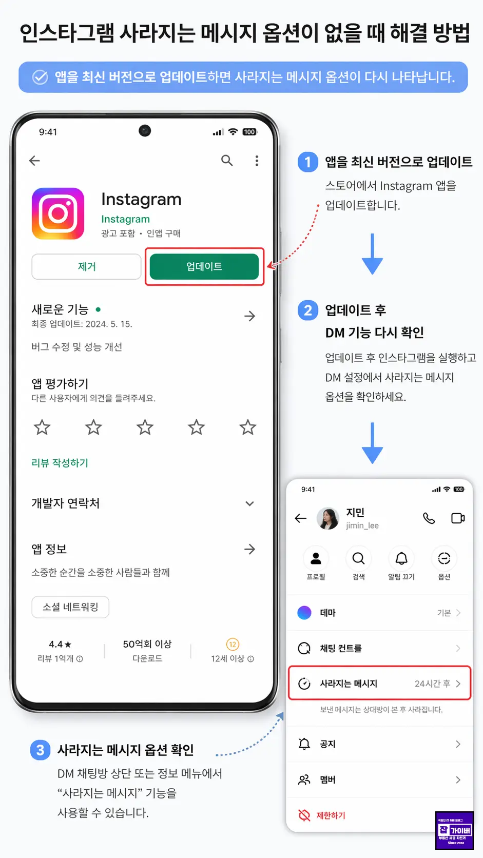 사라지는 메시지가 켜지지 않거나, 메시지가 사라지지 않거나, 사진·동영상 옵션이 제대로 보이지 않는다면 앱 오류나 네트워크 문제일 수 있습니다. 이때는 아래 순서대로 확인하면 됩니다.