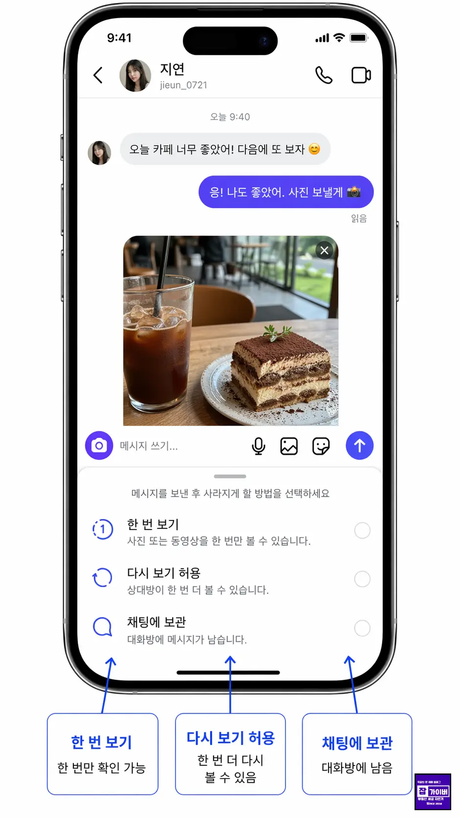 일반 채팅처럼 오래 남기고 싶다면 채팅에 보관을 선택해야 하고, 한 번만 보여주고 싶다면 한 번 보기 옵션을 사용합니다.