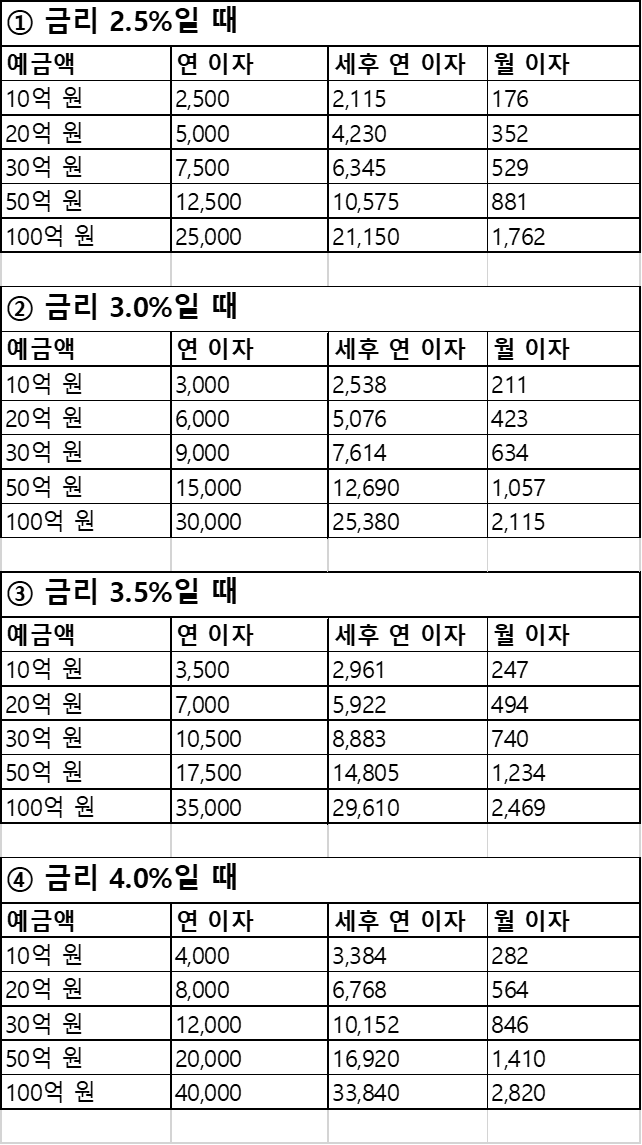 | 예금액 | 연 이자 | 세후 연 이자 | 월 이자 |