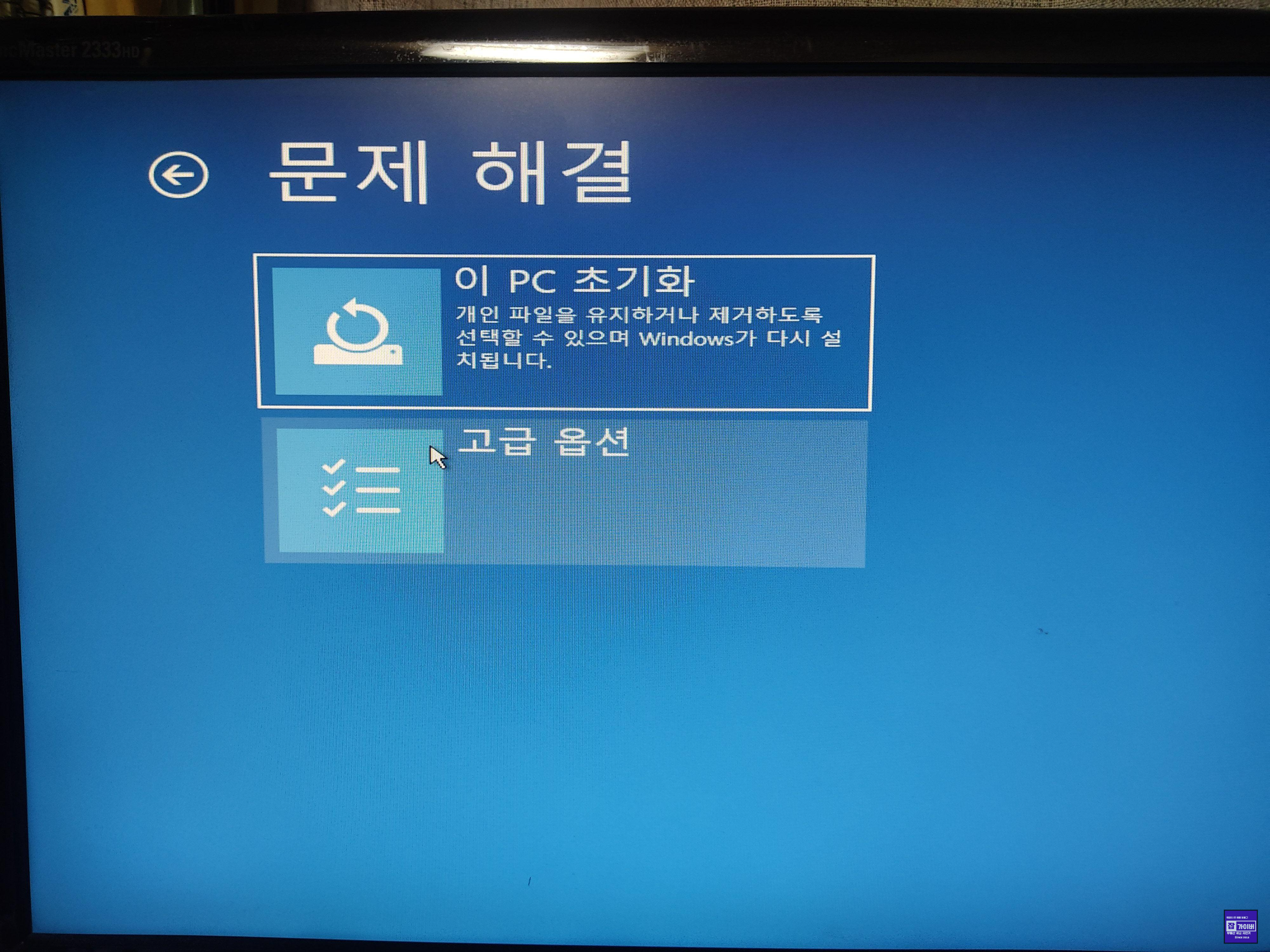 - USB를 이용해 부팅한 뒤, 컴퓨터 복구 옵션을 선택합니다.
