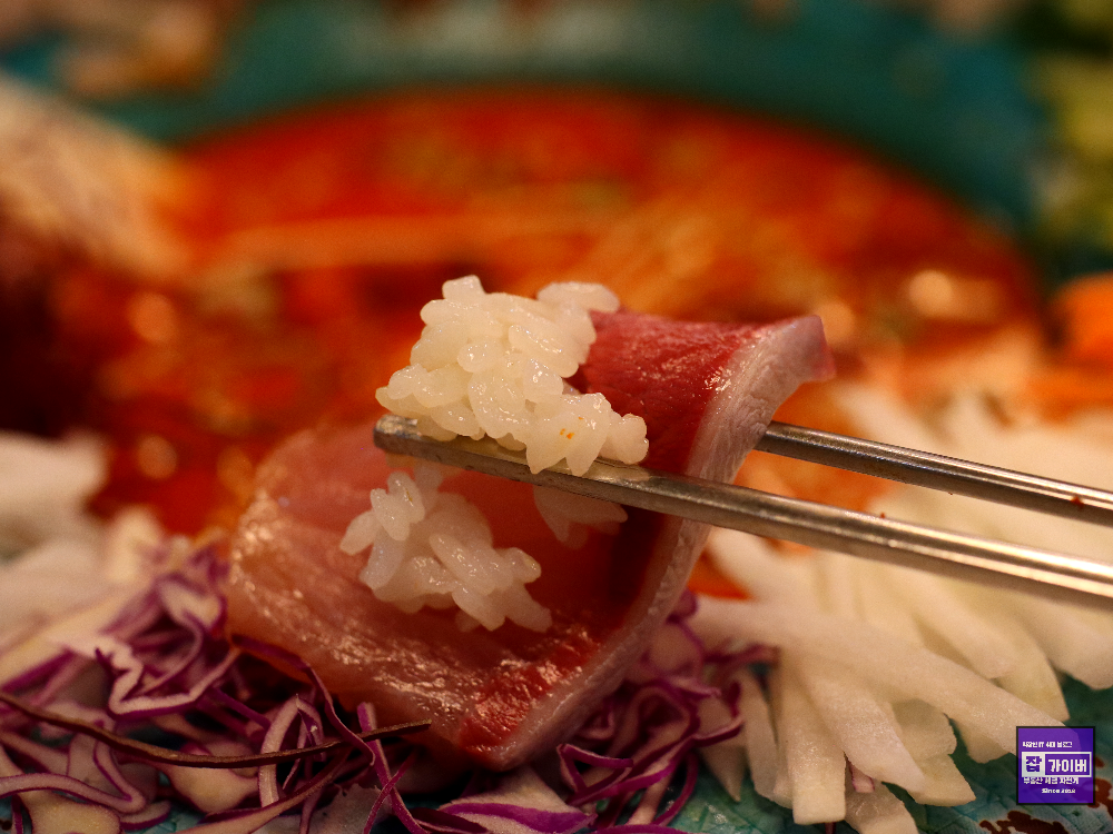 고소하면서도 부드러운 대방어의 살코기와 밥을 함께 먹으면 그 맛이 극대화되더라고요.