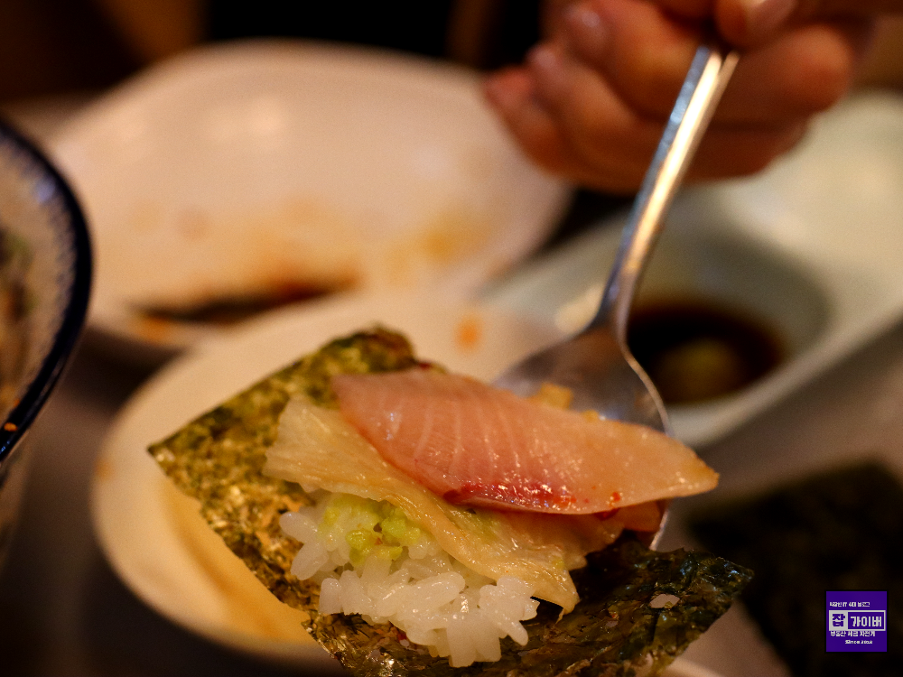 대방어의 고소함과 함께 나오는 백김치, 그리고 밥을 올려서 함께 먹으면 더욱 맛있고, 특히 느끼할 수 있는 대방어를 이렇게 다양한 반찬들과 함께 먹으니 질리지 않고 끝까지 맛있게 먹을 수 있었습니다.