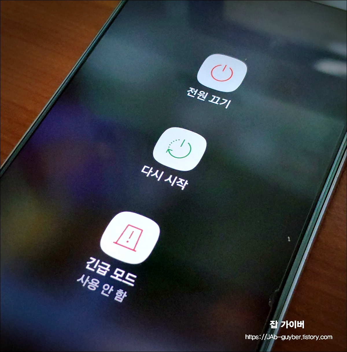 전원 버튼(측면 버튼)을 길게 눌러 *전원 끄기’를 선택하고 기기를 완전히 종료합니다.