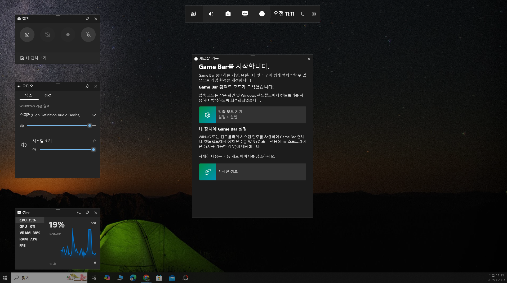 - Win + G 키를 눌러 Xbox Game Bar가 활성화되어 있는지 확인