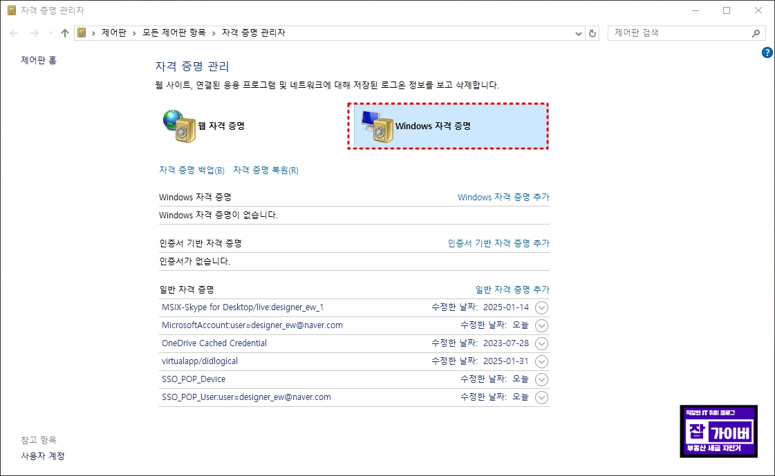 자격 증명 관리자에서 기존 자격 증명 삭제