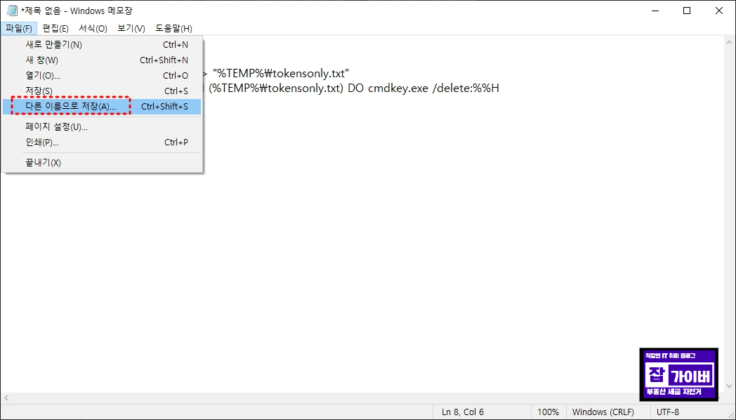 다른 이름으로 저장을 선택하고 파일 이름을 Clear_Credentials.bat로 지정하여 저장합니다.