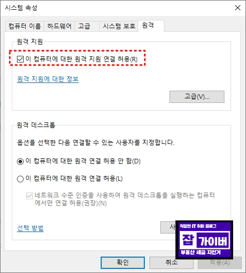 - 원격 탭에서 이 컴퓨터에 대한 원격 연결 허용을 체크합니다.