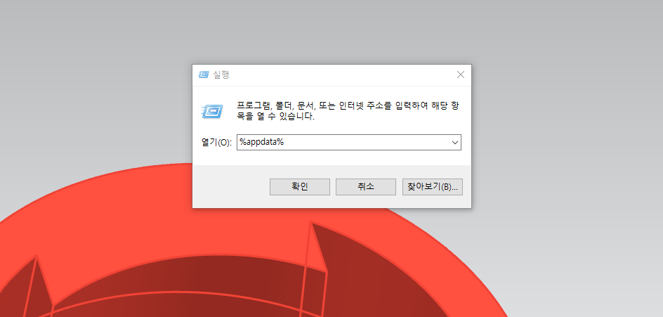 🔹 실행 창이 열리면 "%appdata%"를 입력하고 확인을 클릭합니다.