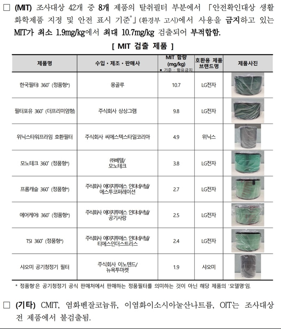MIT도 같은 '이소티아졸리논' 계열의 물질로 피부 및 호흡기에 유해할 수 있기 때문에, 필터에서 검출된 것은 심각한 문제입니다.