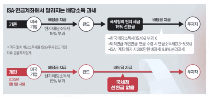 ✅ 기존에는 해외투자 펀드의 배당소득세가 이연되거나 낮은 세율이 적용되었지만, 2025년부터는 즉시 과세되는 방식으로 바뀝니다.