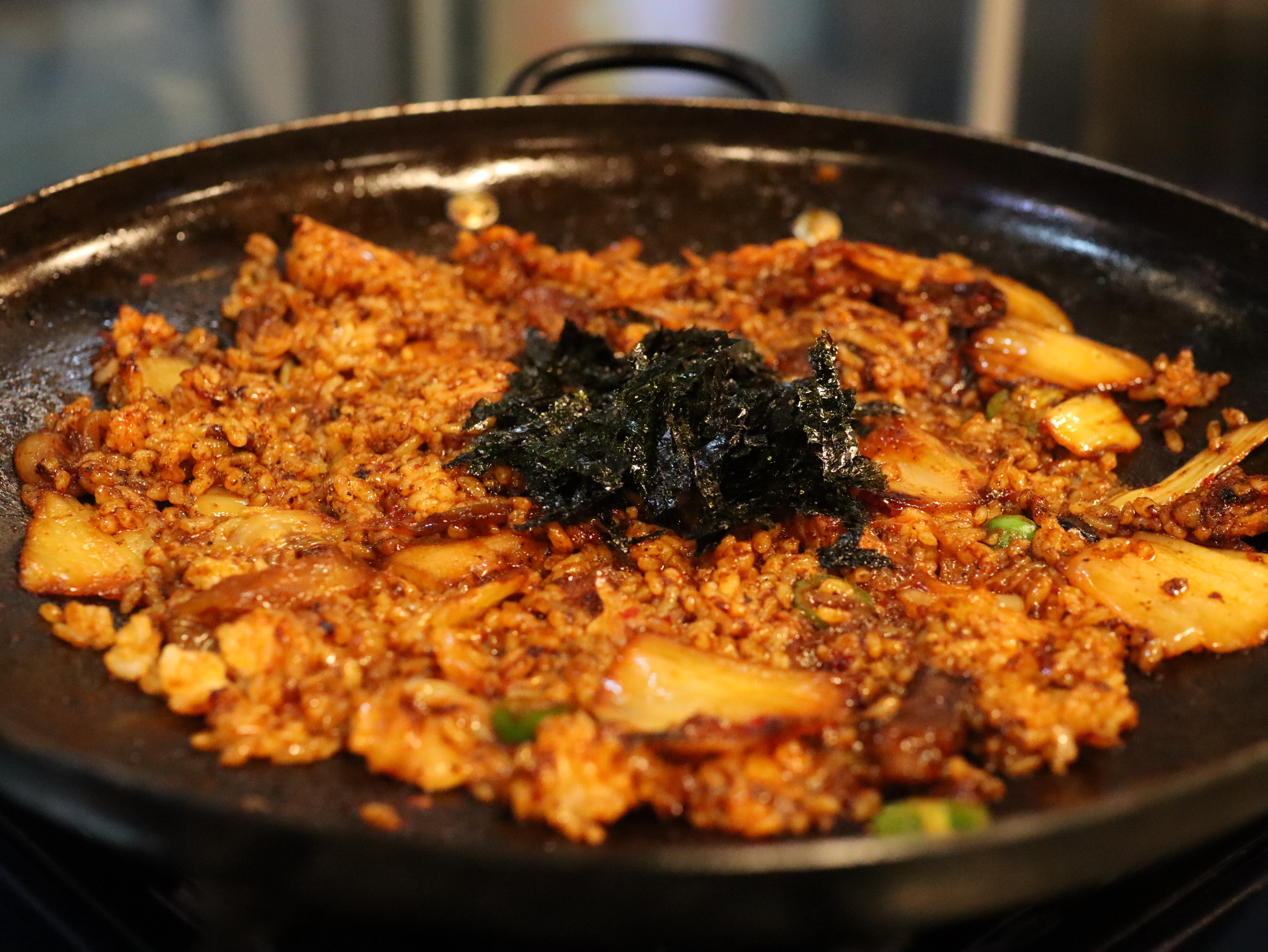 주방에서 완벽하게 볶아진 윤기 좔좔 치즈 볶음밥이 나왔습니다.