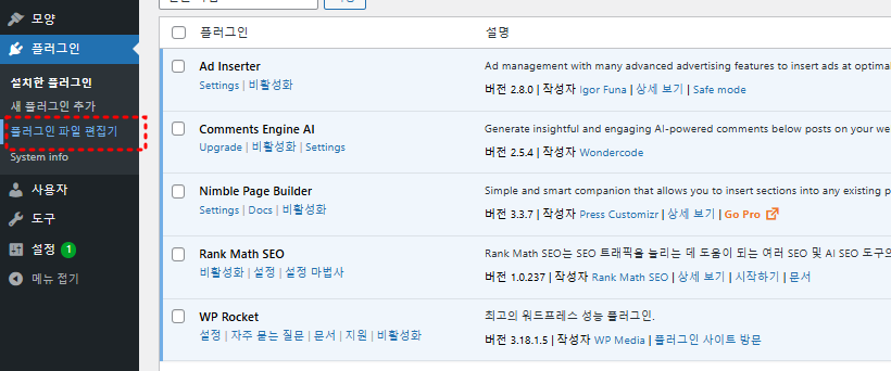 - 워드프레스 관리자 페이지 → 플러그인 → 설치된 플러그인