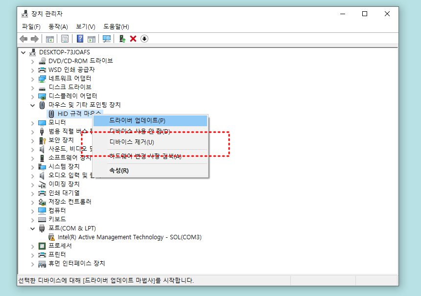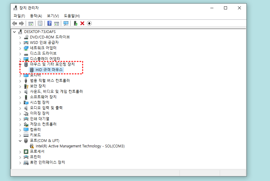 - 여러 개 표시된다면 현재 사용 중인 마우스 외의 장치는 삭제