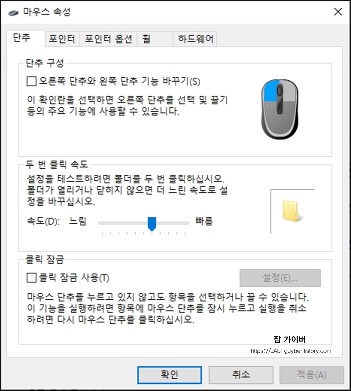 버튼 탭에서는 오른손잡이와 왼손잡이에 맞춰 기본 단추를 바꾸는 설정이 핵심입니다. 기본값은 왼쪽 버튼이 선택·드래그, 오른쪽 버튼이 메뉴를 여는 방식이지만, 왼손으로 마우스를 잡는 사람은 이 순서를 반대로 바꾸는 편이 훨씬 자연스럽습니다.