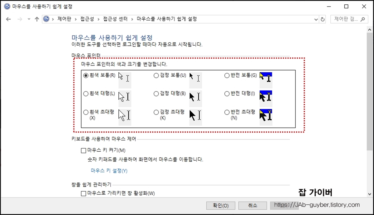 윈도우10 최신 빌드에서는 설정 앱에서도 같은 기능을 제공하지만, 제어판 쪽이 더 익숙하다면 이 경로로 마우스 포인터를 변경해도 무방합니다.