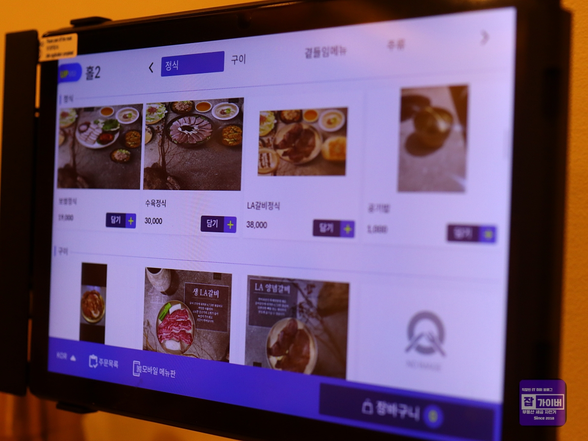제가 갔을 때도 큰 테이블이 마련되어 있었고, 각 자리마다 환기 시설도 잘 되어 있어 쾌적하게 식사할 수 있었어요. 방이동고기집답게 고기 구이 단품을 따로 주문할 수 있는데, 고기를 먹을 때 향긋한 숯불 냄새가 전혀 배지 않아서 매우 편안하게 즐길 수 있었습니다. 그래서 저는 LA갈비 정식 2인분을 주문했죠.