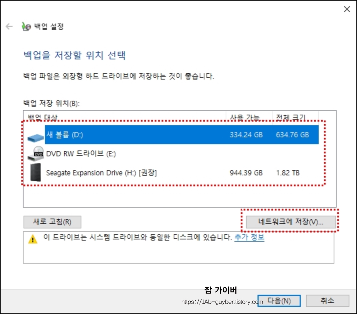 만약 외장하드나 내장 하드에 용량이 부족하다면 네트워크를 이용한 백업도 제공합니다.