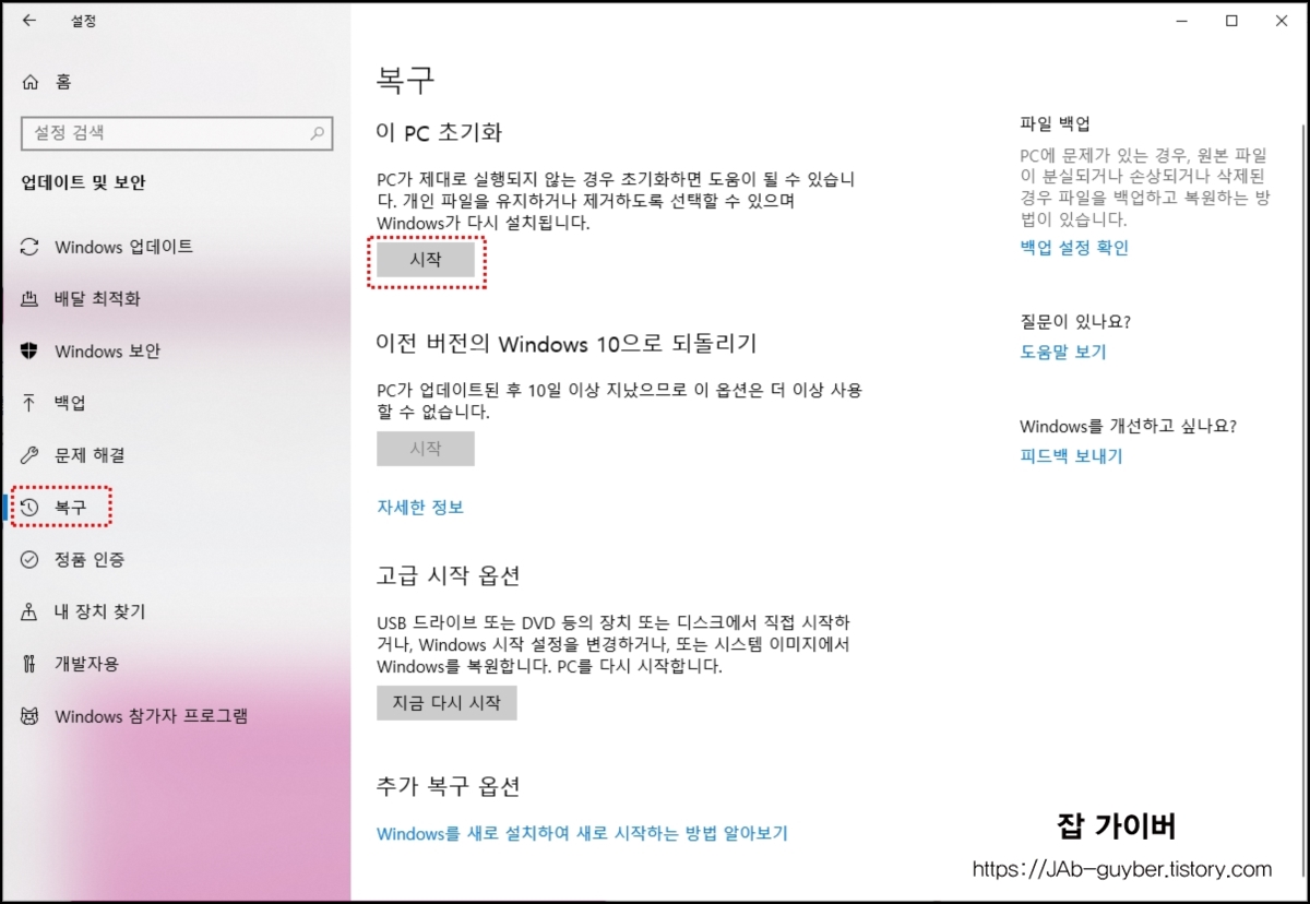 업데이트 및 보안 기능에서 복구 기능을 선택하면 3가지의 윈도우 초기화 기능을 제공합니다.