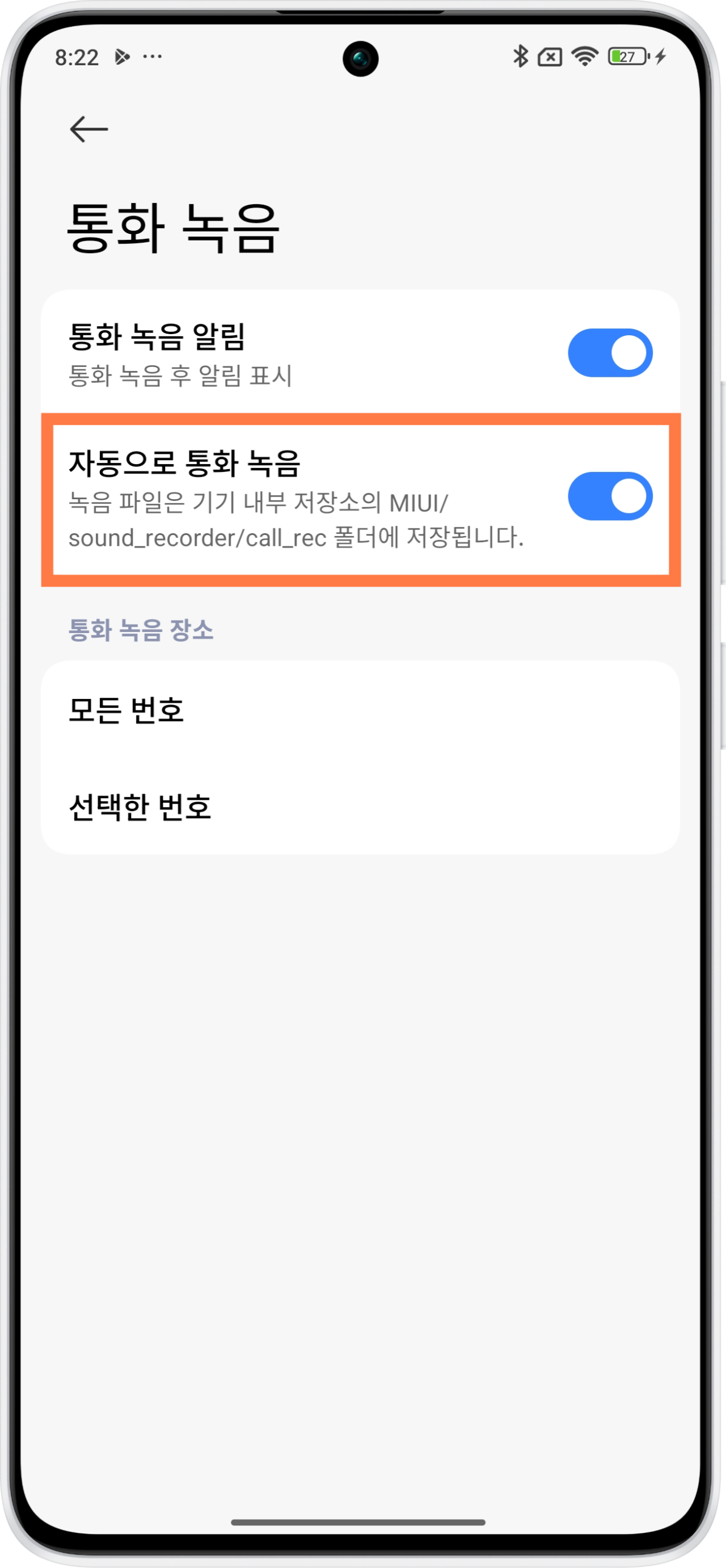 - ‘통화 녹음 알림’ 옵션은 상대방에게 녹음이 진행된다는 알림을 보내는 기능이 아닙니다.