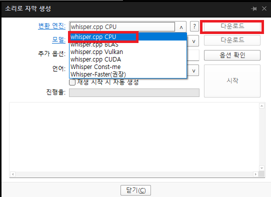 소리로 자막 생성 툴에서 사용할 엔진과 모델을 선택합니다.