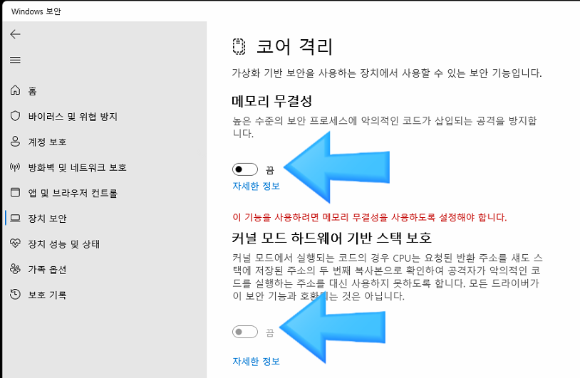 - 장치 보안 → 코어 격리 클릭