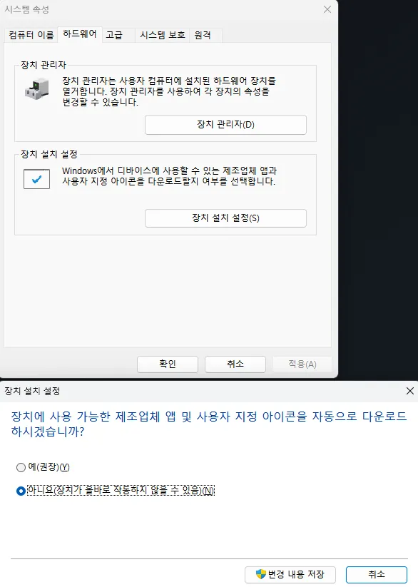 윈도우 시작 메뉴에서 우클릭 후 '시스템'을 선택, '고급 시스템 설정'으로 이동하여 '하드웨어' 탭의 '장치 설치 설정'을 클릭합니다.