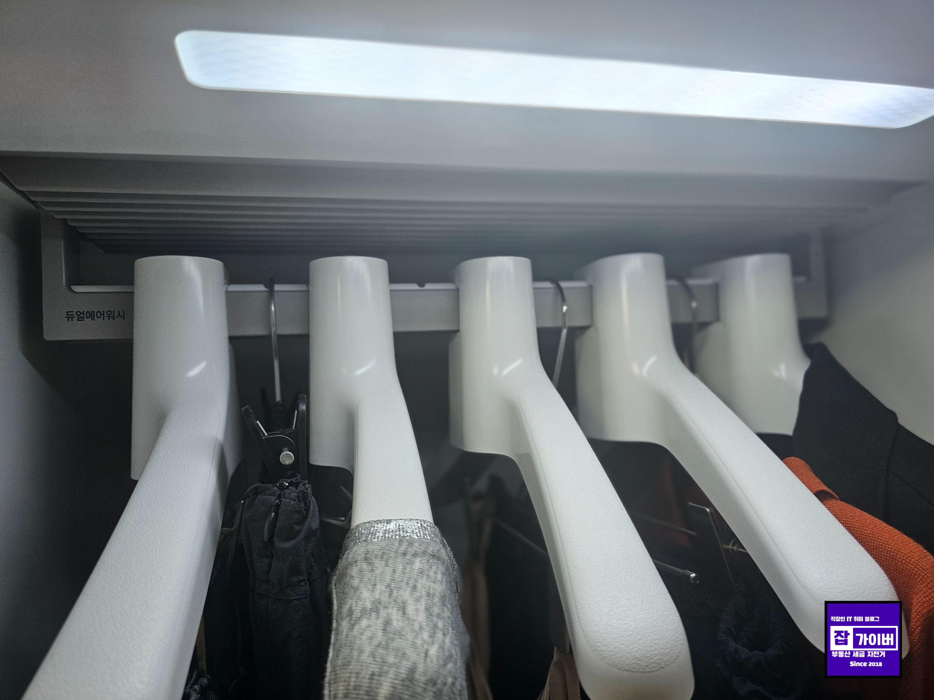 LG 스타일러와 비교했을 때 흔들림 없이 바람으로 먼지를 제거하는 방식 덕분에 소음이 훨씬 적더라고요. 집에 아기가 있는 가정이라면 이 부분이 정말 큰 장점일 거예요. 저희는 밤에 살균 코스를 돌릴 때가 많은데, 아기가 자는 동안에도 사용할 수 있을 정도로 조용했어요.