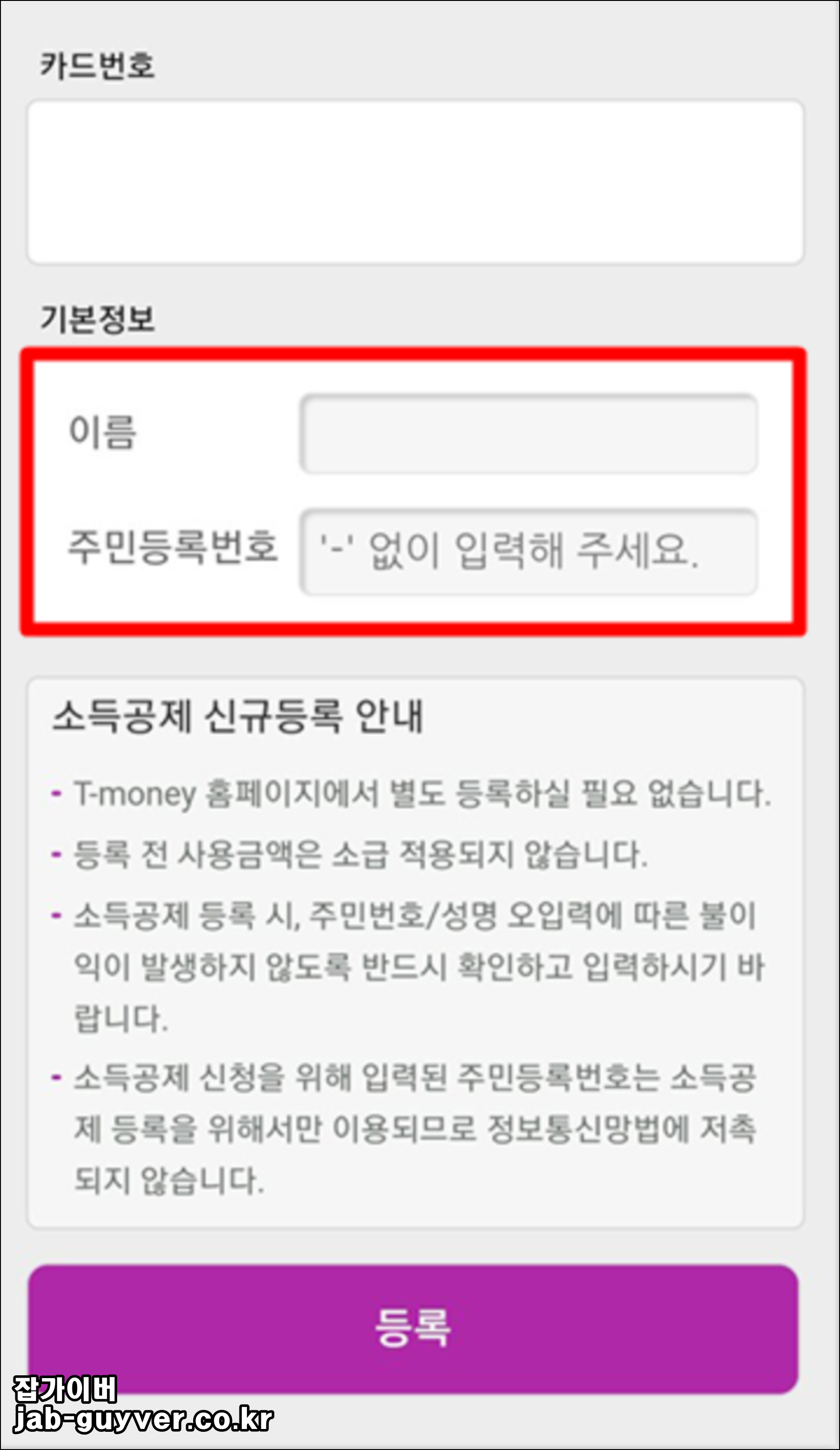 자신의 이름과 주민등록번호를 입력하는것으로 연말정산 소득공제 신청이 가능하며 별도의 티머니 홈페이지를 통해 등록할 필요가 없습니다.