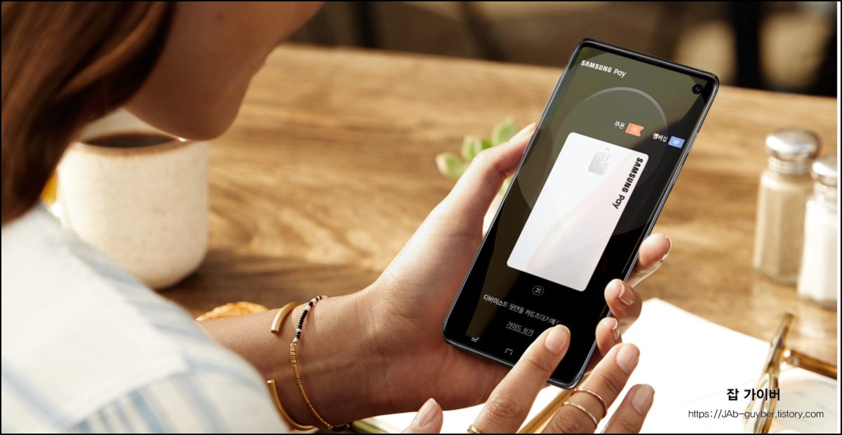 - 우선 삼성페이는 삼성전자의 핸드폰인 갤럭시노트나 갤럭시 S, 갤럭시 J 시리즈 등에서 사용 가능한 앱입니다.