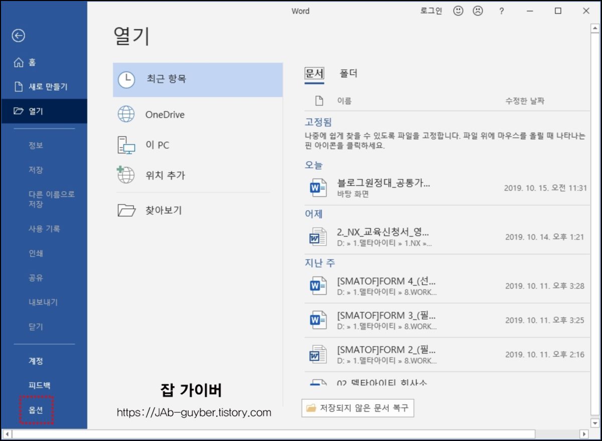 워드를 실행 후 옵션기능으로 들어갑니다.