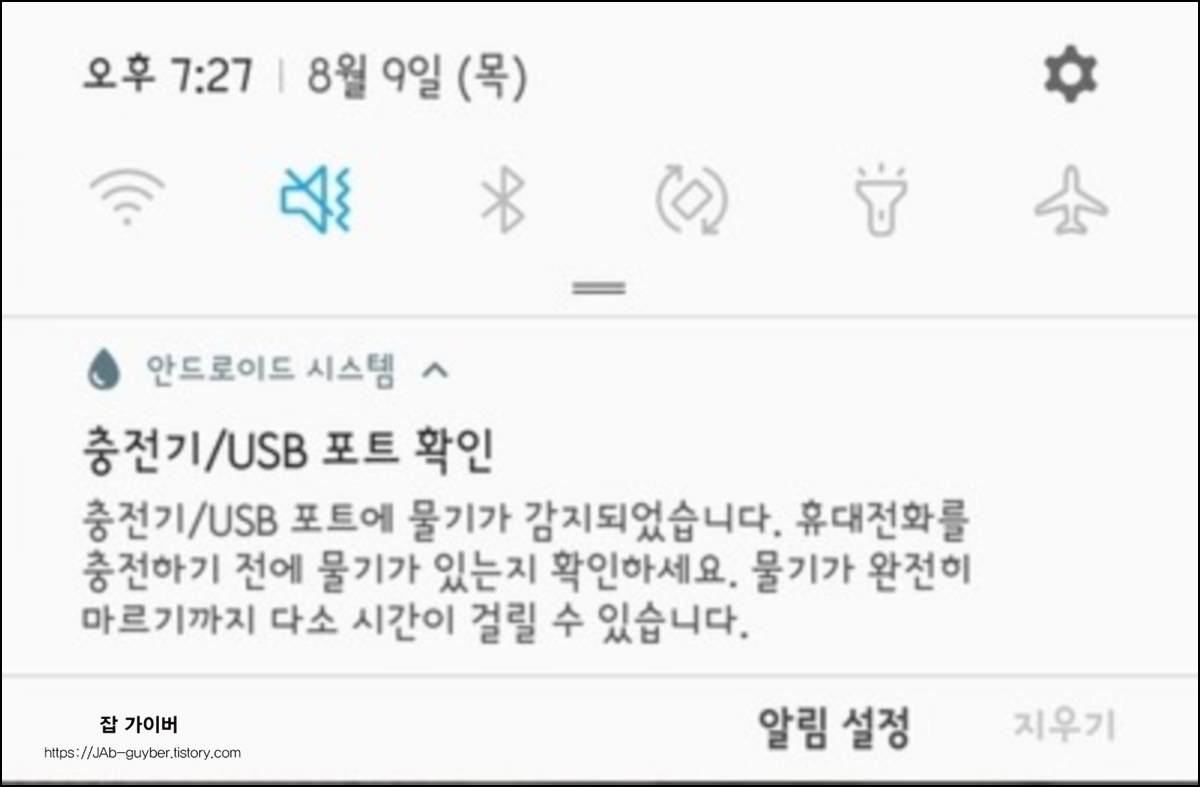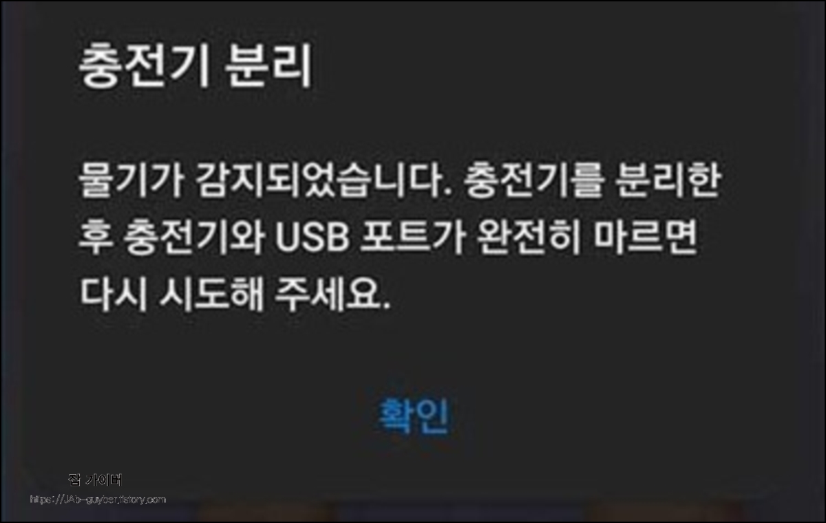 그리고 갤럭시 핸드폰의 경우 특히 USB 포트쪽에 물이 들어간 경우 USB 포트에 물기가 감지되었다는 문구가 표시되기 때문에 더 주의해야 합니다.