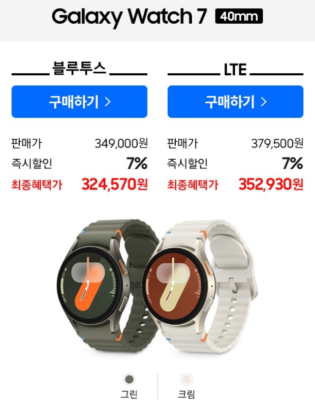 | 갤럭시 워치7 40mm LTE | 1.2 인치 | 최대 40시간 | 심박수 측정, 삼성페이, 수면 추적, LTE 통신 가능 | 399,000원 |