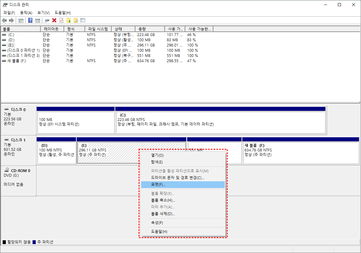 참고 : 윈도우10 파티션 드라이브 문자변경 - A, B, C, D, E, F 위치변경