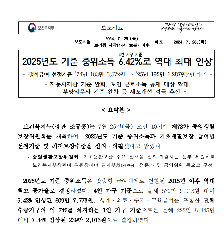 ✅ 2025년 기준 중위소득이 역대 최대폭(6.42%) 인상!